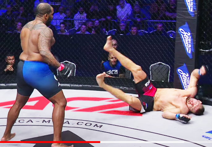 100kg超の巨漢が豪快に吹っ飛ぶ!元ヘビー級王者が豪腕パンチで20秒殺KO(ACA公式YouTubeより)