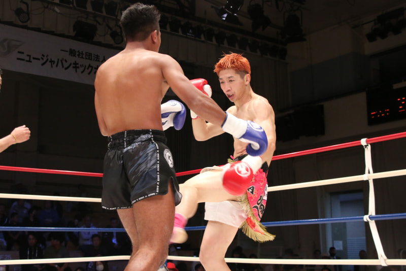 波賀(右)はサクレックにロ―キックを入れていく