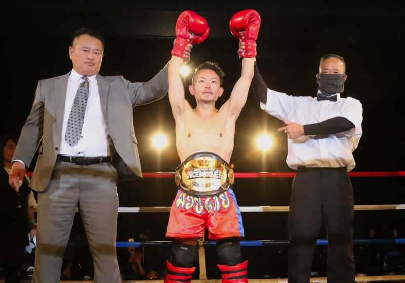 初防衛に成功したTOMOTAKA(中)。歯医者が勝者になった