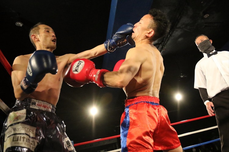 栗崎(左)の左ストレートがTOMOTAKA(右)の顔面を捉える