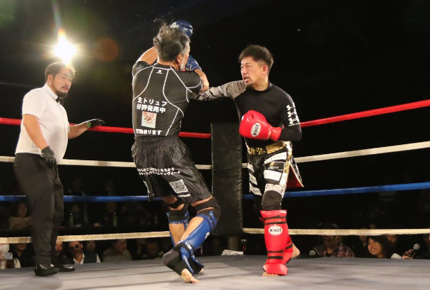 この右ストレートでYASU(右)がトリュフソルト(左)からダウンを奪う