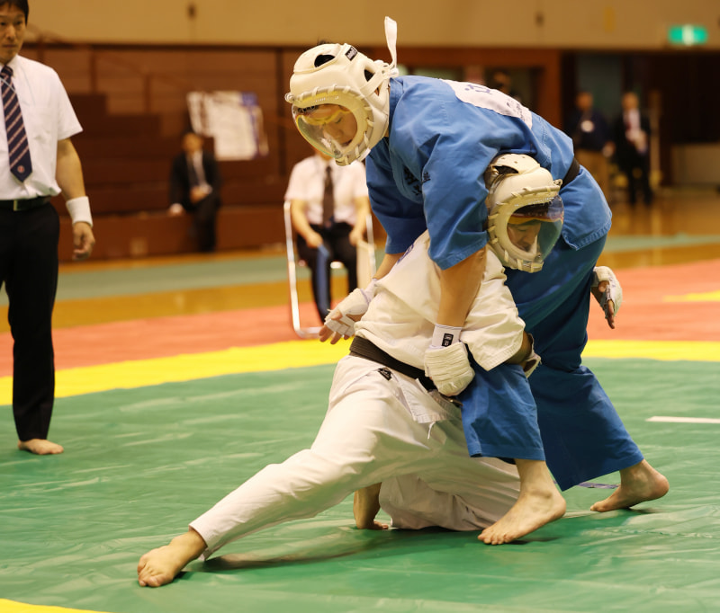 両足タックルで虚を突く服部(白)