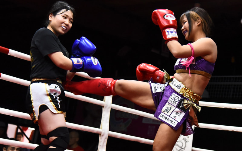 エキシビションマッチでy対戦した新垣暖乃(左)と有里(右)