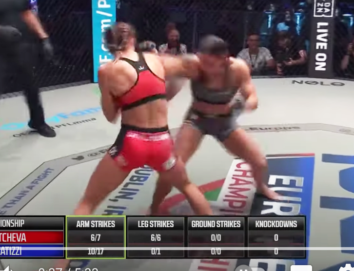 右フックがスカティジの左目を強襲(PFLMMA公式YouTubeより)