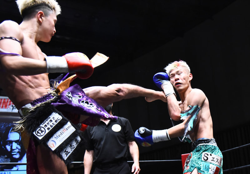 井上竜太(右)に左ハイを見舞うマルちゃん(左)