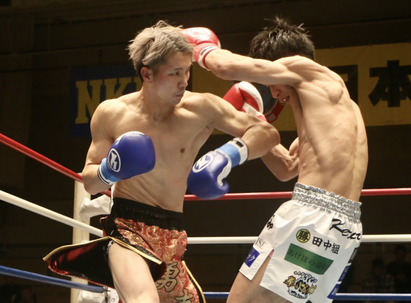 勇志(左)が、このヒジ打ちからの右フックで最初のダウンを奪った