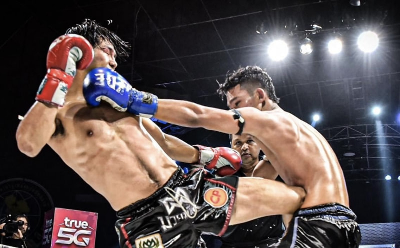 蹴りを入れる福田にペットナムヌンはパンチを伸ばす