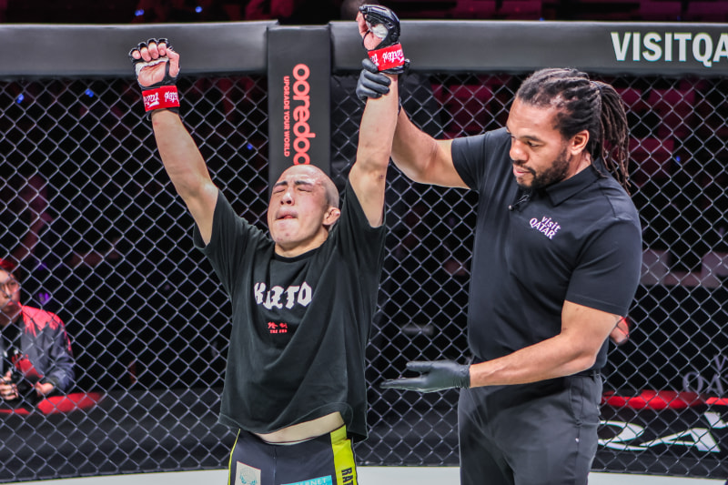 プロ初黒星後、再起戦一本が勝ちで感極まった表情の山北©️ONE
