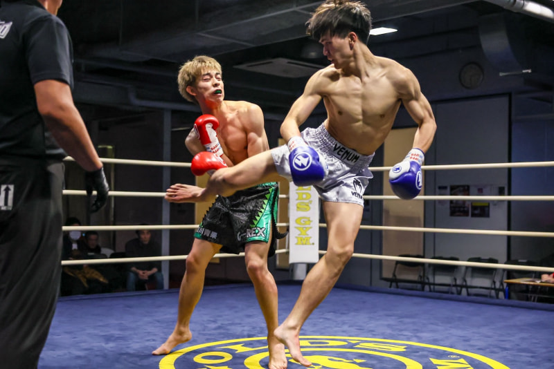 G-REX(左)に後ろ蹴りを見舞うTAKU(右)
