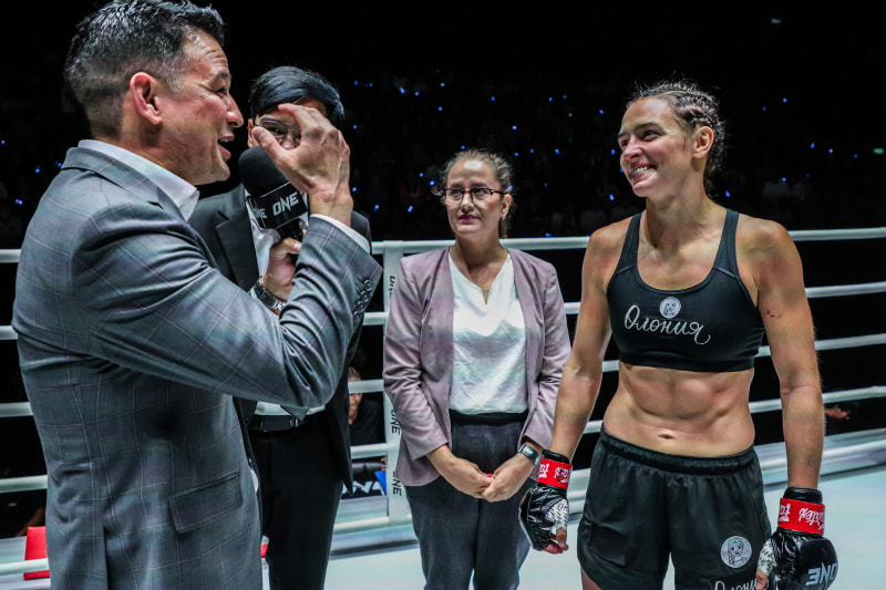 勝利に喜ぶディアチコワ。戦っている時とはまるで別人の愛らしい美女ファイターだ。©️ONE