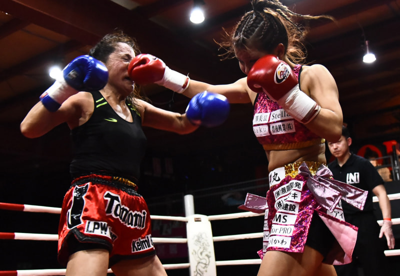 たまにゃん(左)との打ち合うユウリ・ルーククロンタン(右)