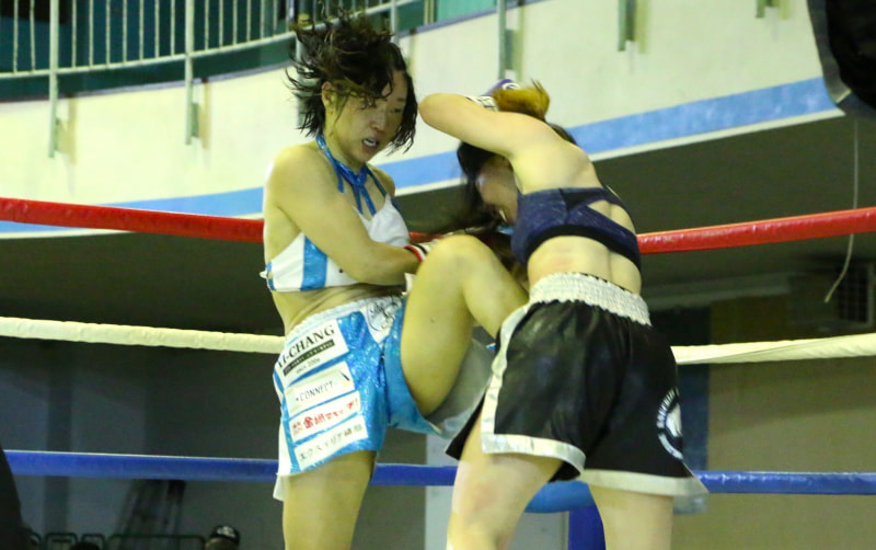 NA☆NAは首相撲で優位に立ち、ヒザ蹴りで追い込む