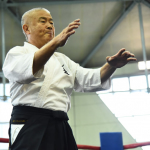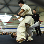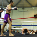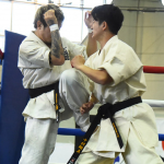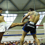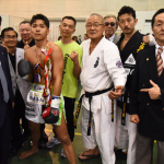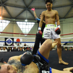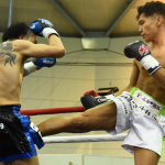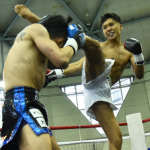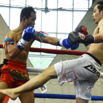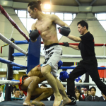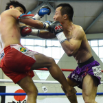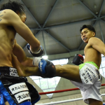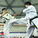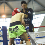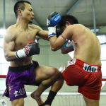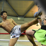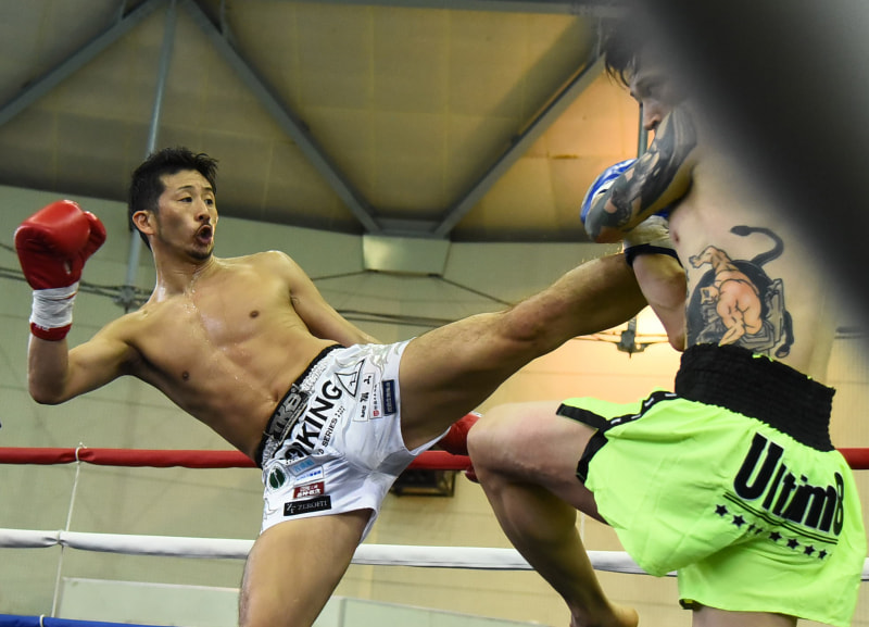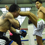 チョン・ハウオン(右)に左ハイを見舞う横山伸吾(左)