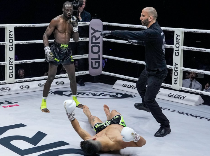 マットに叩きつけられる壮絶な秒殺KO!©️GLORY