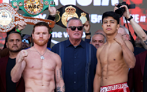 王者カネロ(左)と無敗ムンギアが計量パス!10cmの身長差(Photo by Cris Esqueda/Golden Boy/Getty Images)