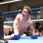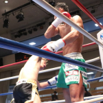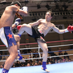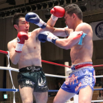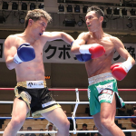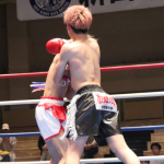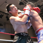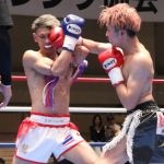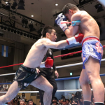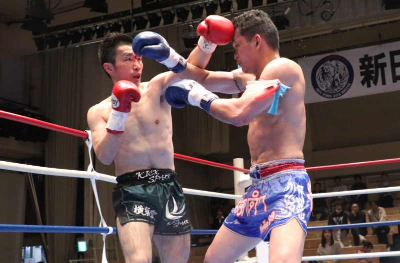 瀬戸口(左)はガン(右)のヒジ打ちで出血し判定負け