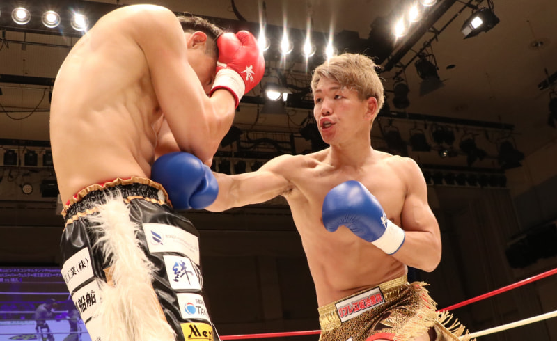 璃久(右)が藤村(左)を下してKrushスーパー・ウェルター級王座決定戦決勝へ進出