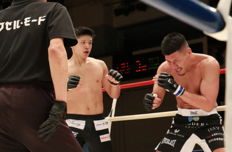 先制ダウンを奪った岸本だが、最後は苦悶の表情