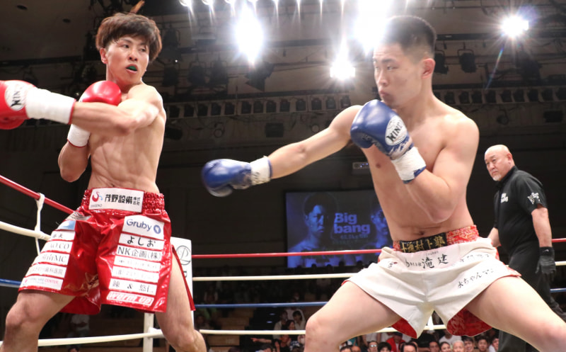 昇也(右)は打ち合いに持ち込み山際(左)から勝利