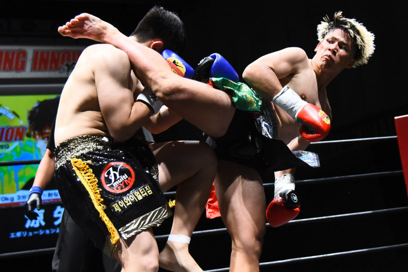 チェ・ミンス(左)に後ろ蹴りを見舞う涼矢(右)