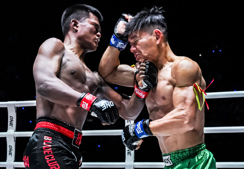 18歳ラウェイ戦士ミン・アウン(左)、肘だけでなく強烈なアッパーも叩き込んだ©️ONE