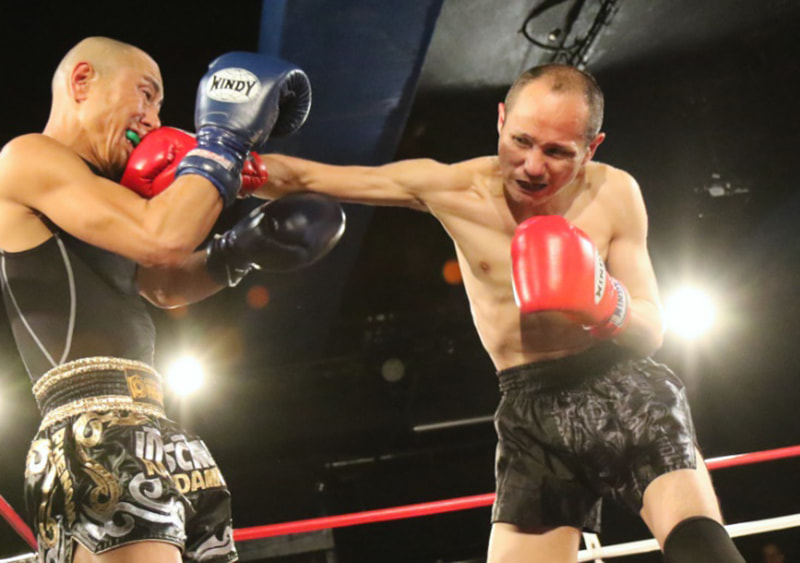 大津(右)の右ストレートがガラちゃん(左)のアゴにヒット