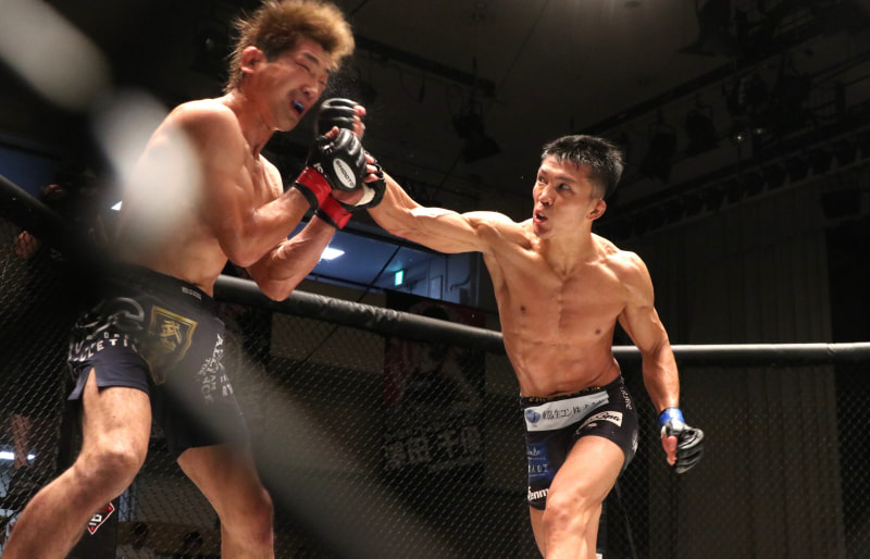 齋藤(右)は打撃ヒットして藤井(左)を判定2-1で下した