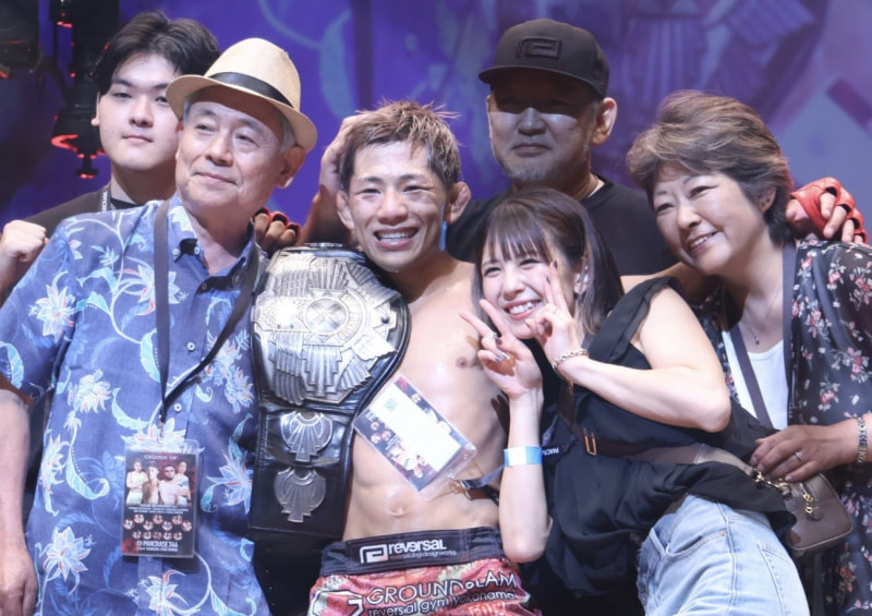 伊藤(中央)が王座初防衛、妻の菅原美優(右から2番目)ら家族が集合した