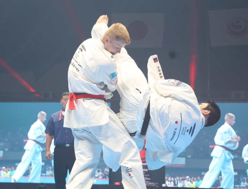 岡田の初戦、優勝候補とも言われた世界大会4位アントン・ジマエフに多彩な技で勝利!