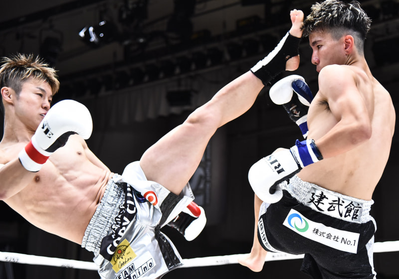 福井萌矢(右)に左ハイを見舞う伊東龍也(左)