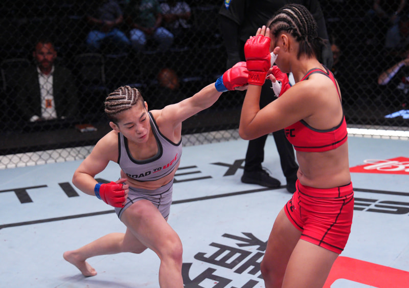 長身のシャオツァンに、フルスイングのパンチを放つ本野