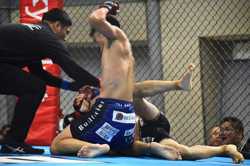 パウンド連打で脇田仁(下)を仕留めた寺崎昇龍(上)