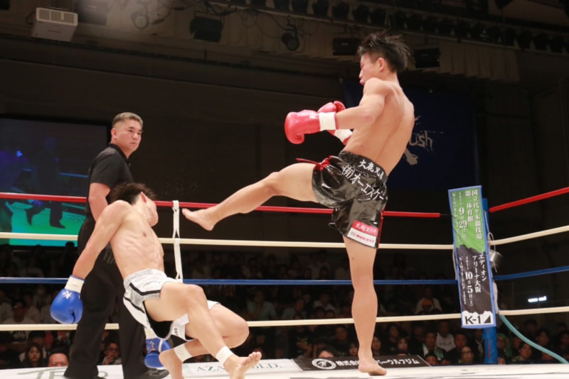 元Krushフライ級王者・大鹿統毅(右)がダウンを奪った