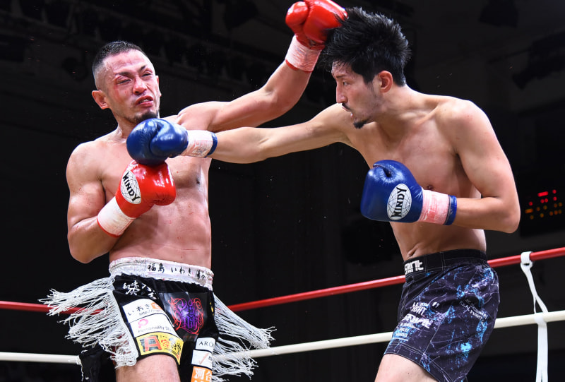 山崎陽一(左)からダウンを奪い、判定勝ちした松下大紀 (右)