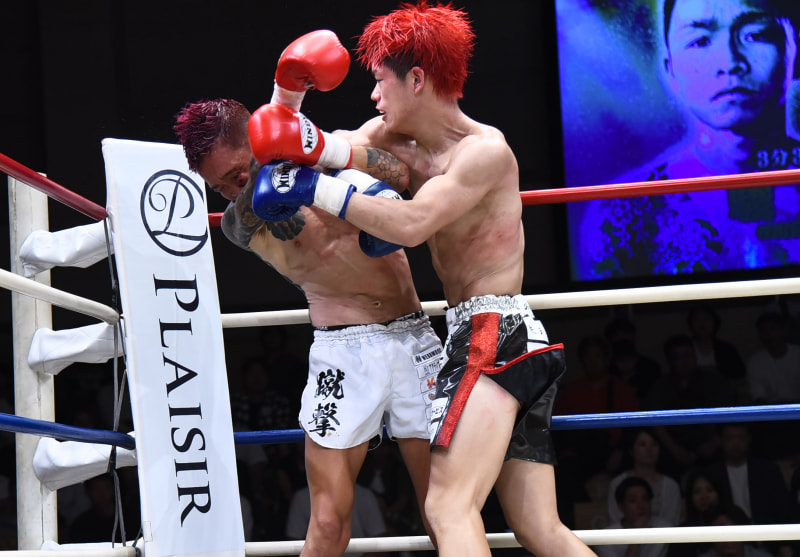 駿太(左)をヒジで追い込む竹添翔太(右)