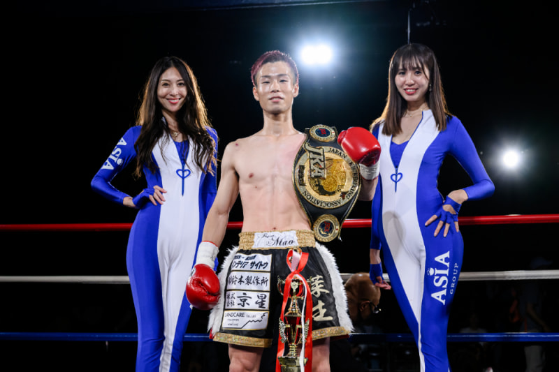 勝利してベルトを持つ西原