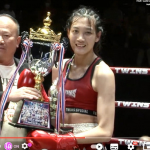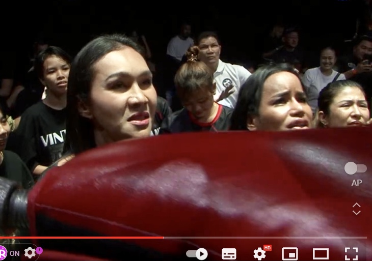 リングサイドでレディボーイ仲間たちと心配そうに見守る (FCC公式YouTubeより)