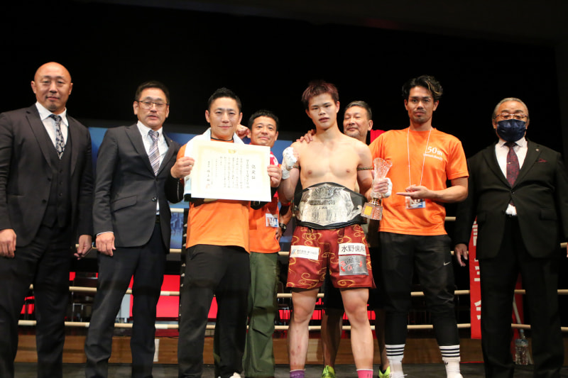 ベルトを巻いたHIROは、武田幸三プロデューサー(左)にヒジありトーナメント開催を直訴した