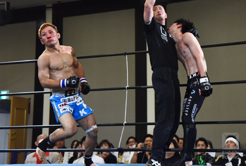 内藤啓人(右)を逆転TKOで下した松岡宏宜(左)