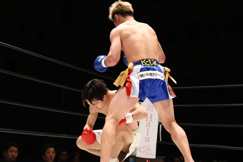 天野のフックがクリーンヒット!西元が崩れ落ちる(C)K-1