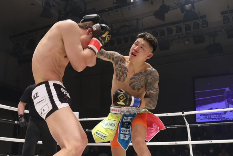 笑顔で打ち合いを仕掛ける蛇鬼(右)
