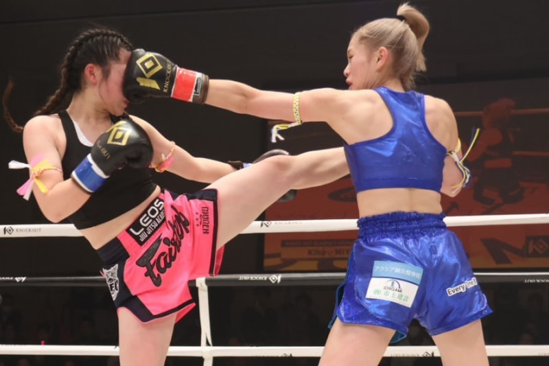 カウンターフックを打つKiho(右)