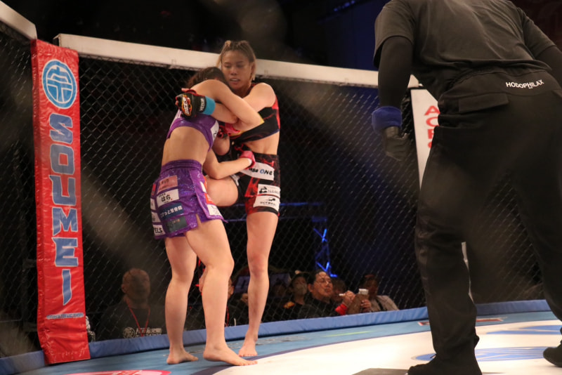ヒザ蹴りを放つ彩綺(右)