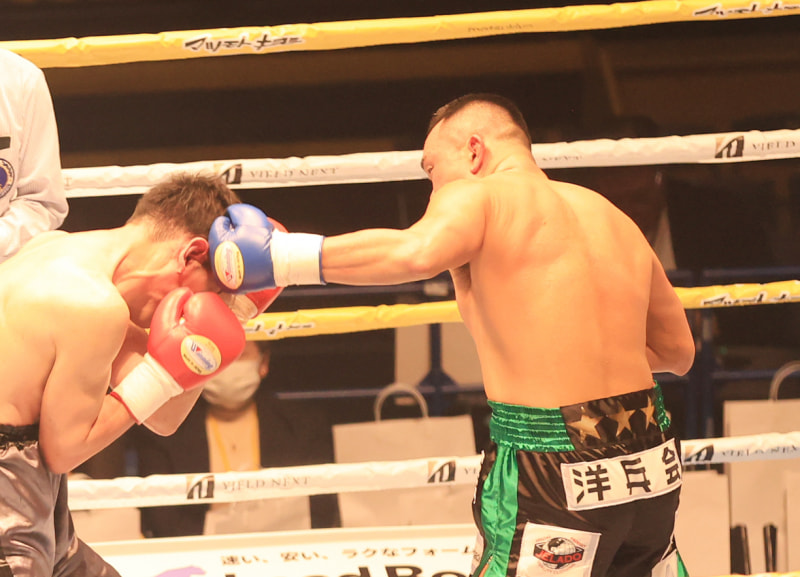 1R、左フックがクリーンヒット、拳をやや痛めたという。