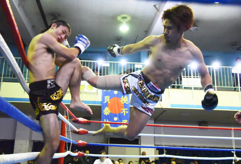 飛び蹴りを見舞う大田原友亮(右)
