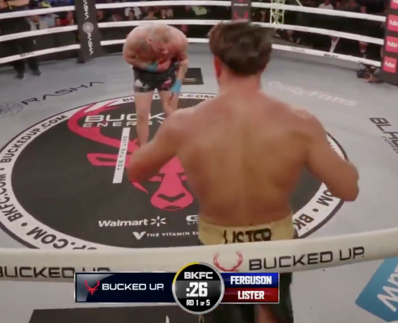 腹押さえながらファーガソンが悶絶ダウン@bareknucklefcより