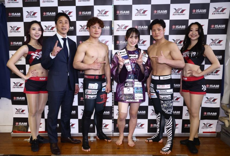 左からX1-VENUS Honokaさん、前田憲作総 合プロデューサー、山田彪太朗選手、 山田彪太朗選手、登島優音選手、X1-VENUS Aikaさん