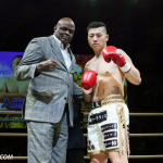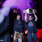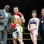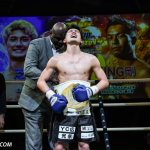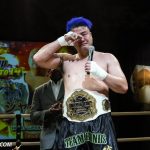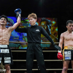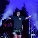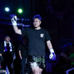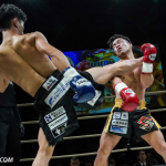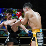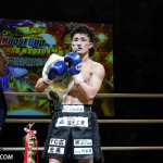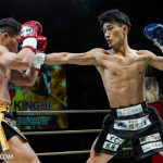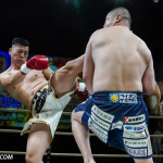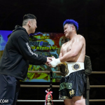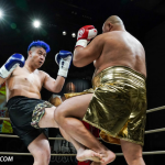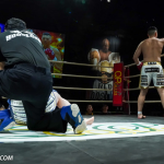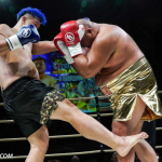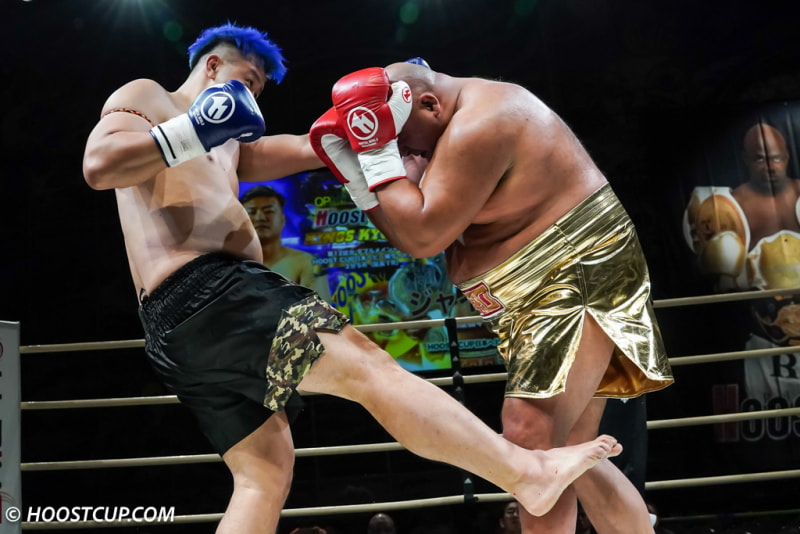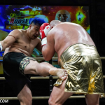 ローキックで攻めるミヤギンとガードするジャイロ