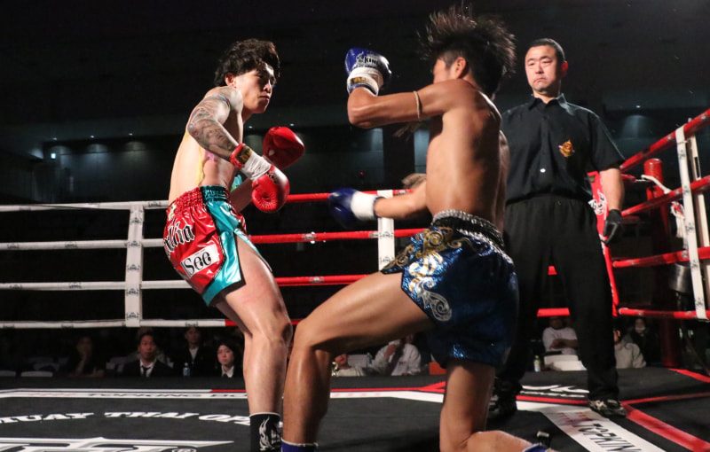 壱(左)がシンクロン(右)を右フックでKOムエタイオープン新王者に