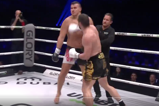 レフェリーの再開を待たずに、カリミアンが右を強打@GLORY_WSより